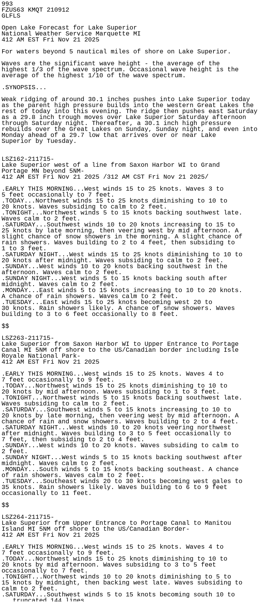 This is the open waters marine forecast for Lake Superior issued at 4:12am EST on Friday.